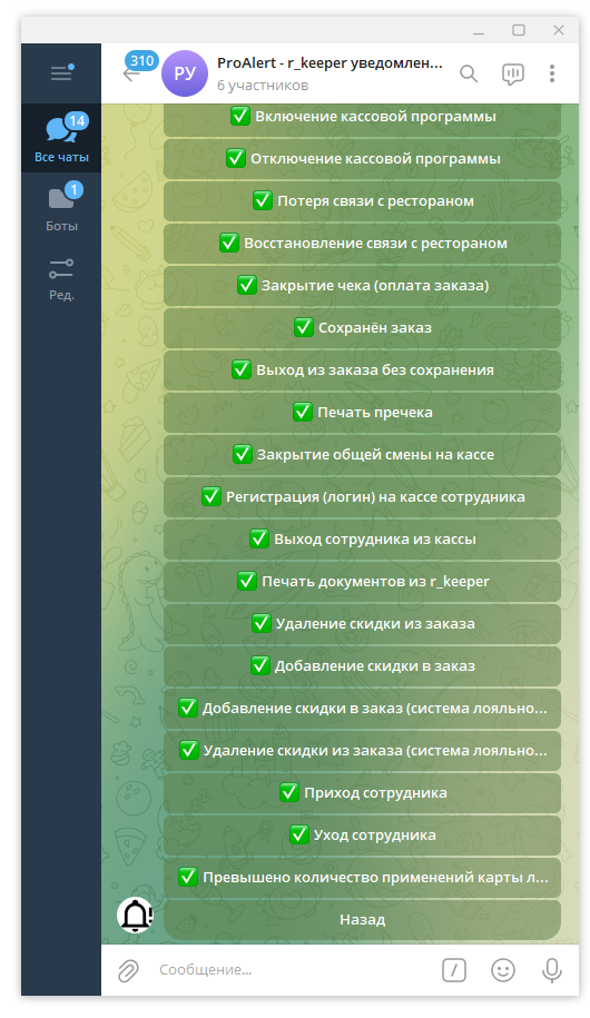 Этот бот самостоятельно присылает оповещения о событиях на кассе, отчёты в конце смены.