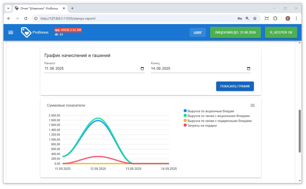 Графический отчёт, который позволяет оценить экономические показатели за выбранный период. Дашборд доступен от ProBonus v1.2.40.217.