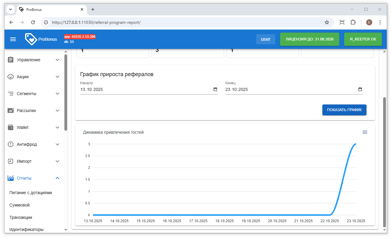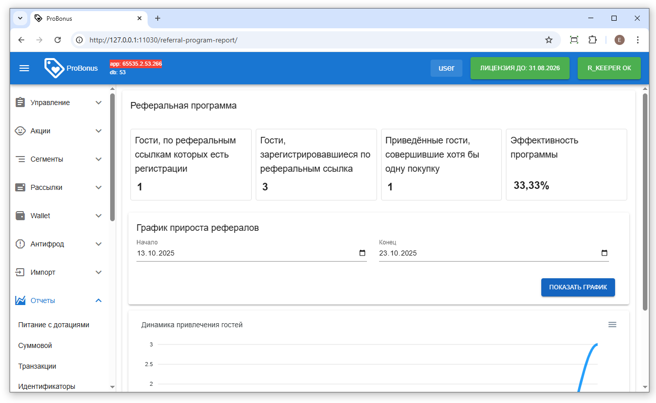 Отчёт «Прирост гостевой базы» доступен в от версии ProBonus 1.2.18.112.