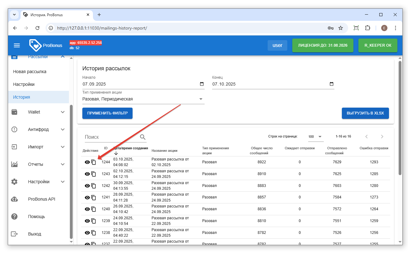 Скопировать рассылку с типом «разовая» можно от версии ProBonus 1.2.46.243. Периодические рассылки копированию не подлежат.