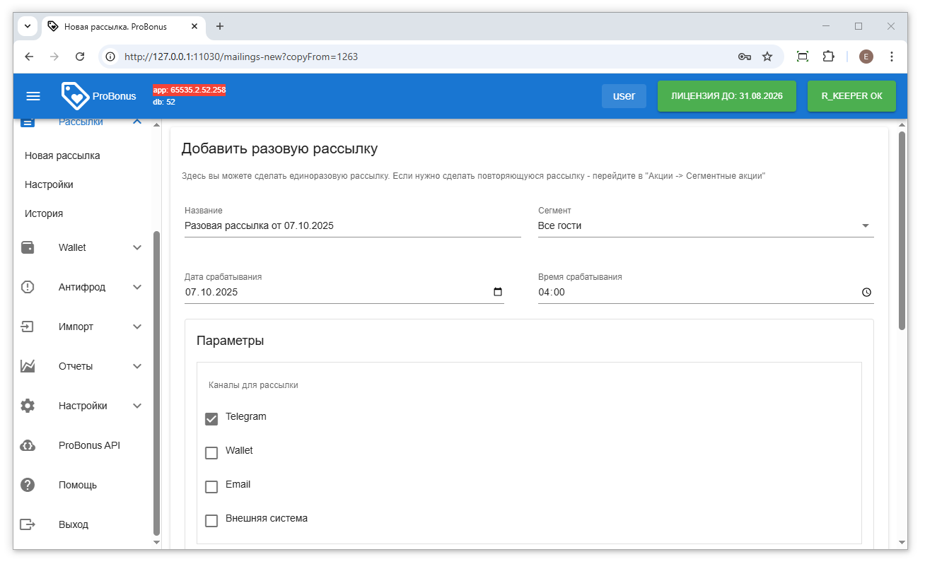 - Рассылка в Телеграм доступна от версии ProBonus 1.2.25.139.