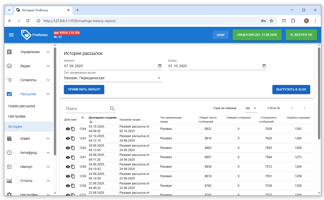 Для удобства поиска историю можно отфильтровать по диапазону дат и по типу рассылки. Сформированный отчет доступен для выгрузки в XLSX-формате.