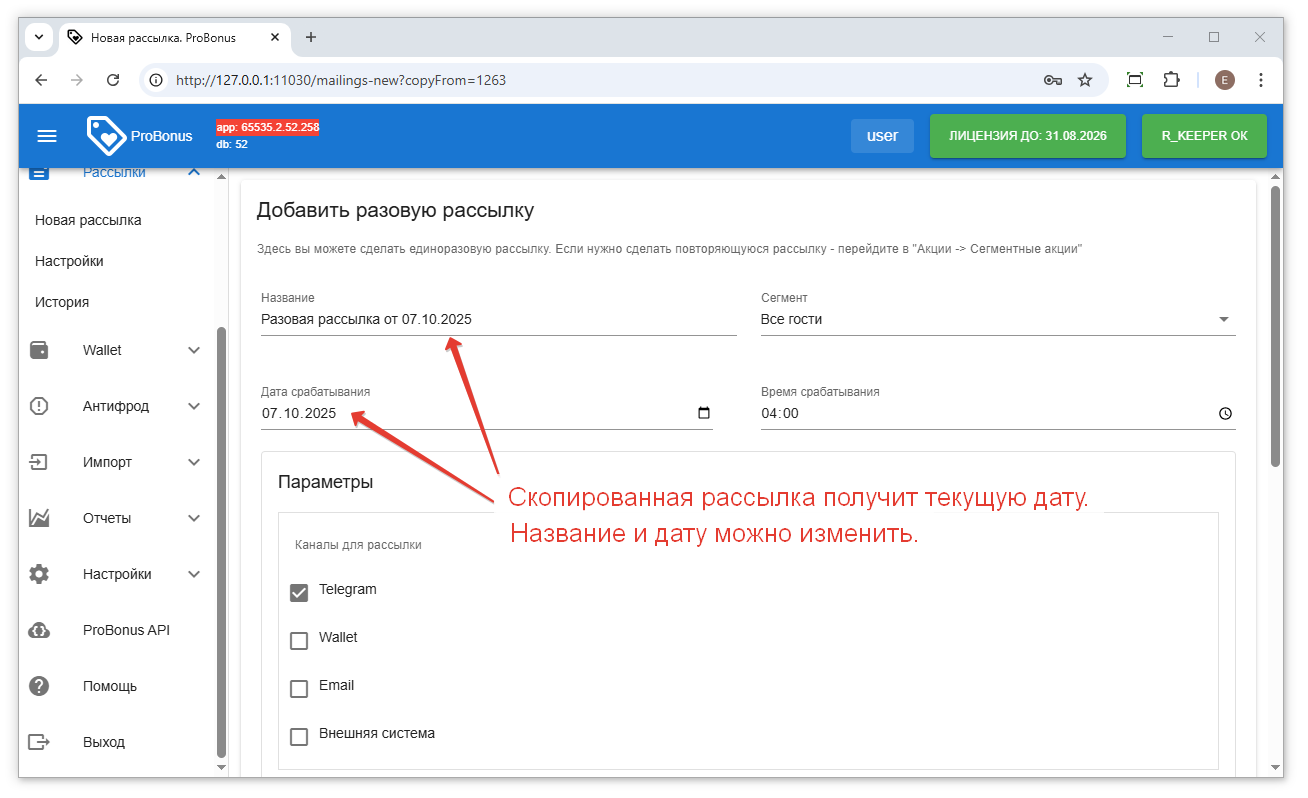 Скопировать рассылку с типом «разовая» можно от версии ProBonus 1.2.46.243. Периодические рассылки копированию не подлежат.