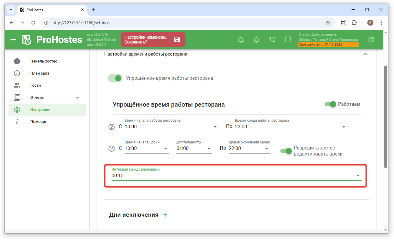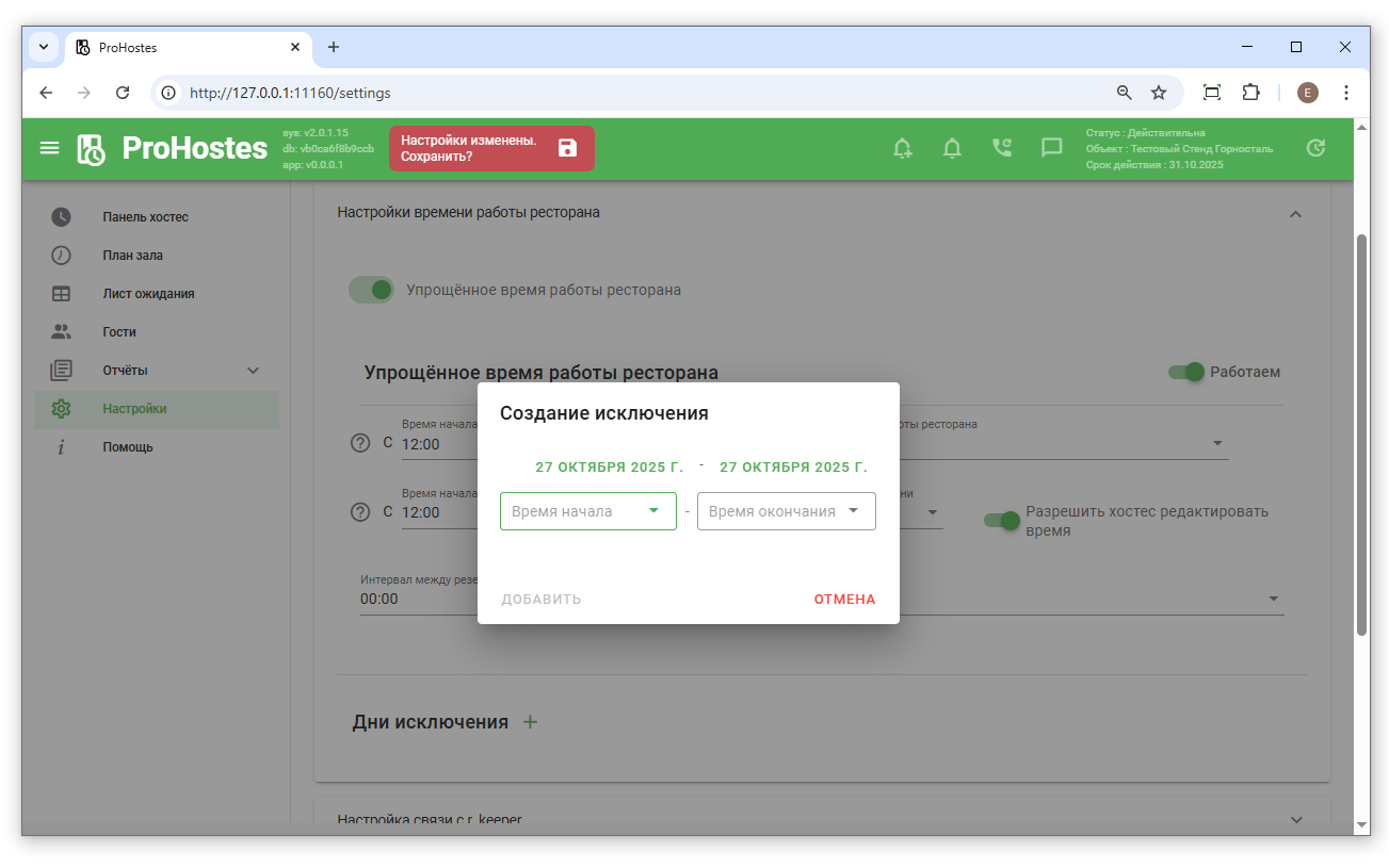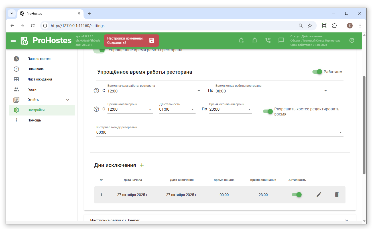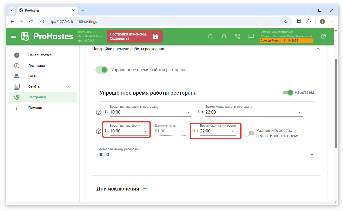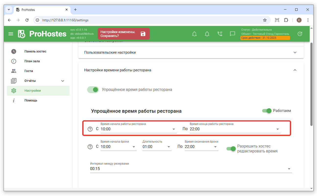 В данном разделе настраивается время работы ресторана - т. е. время, на которое можно забронировать стол.
