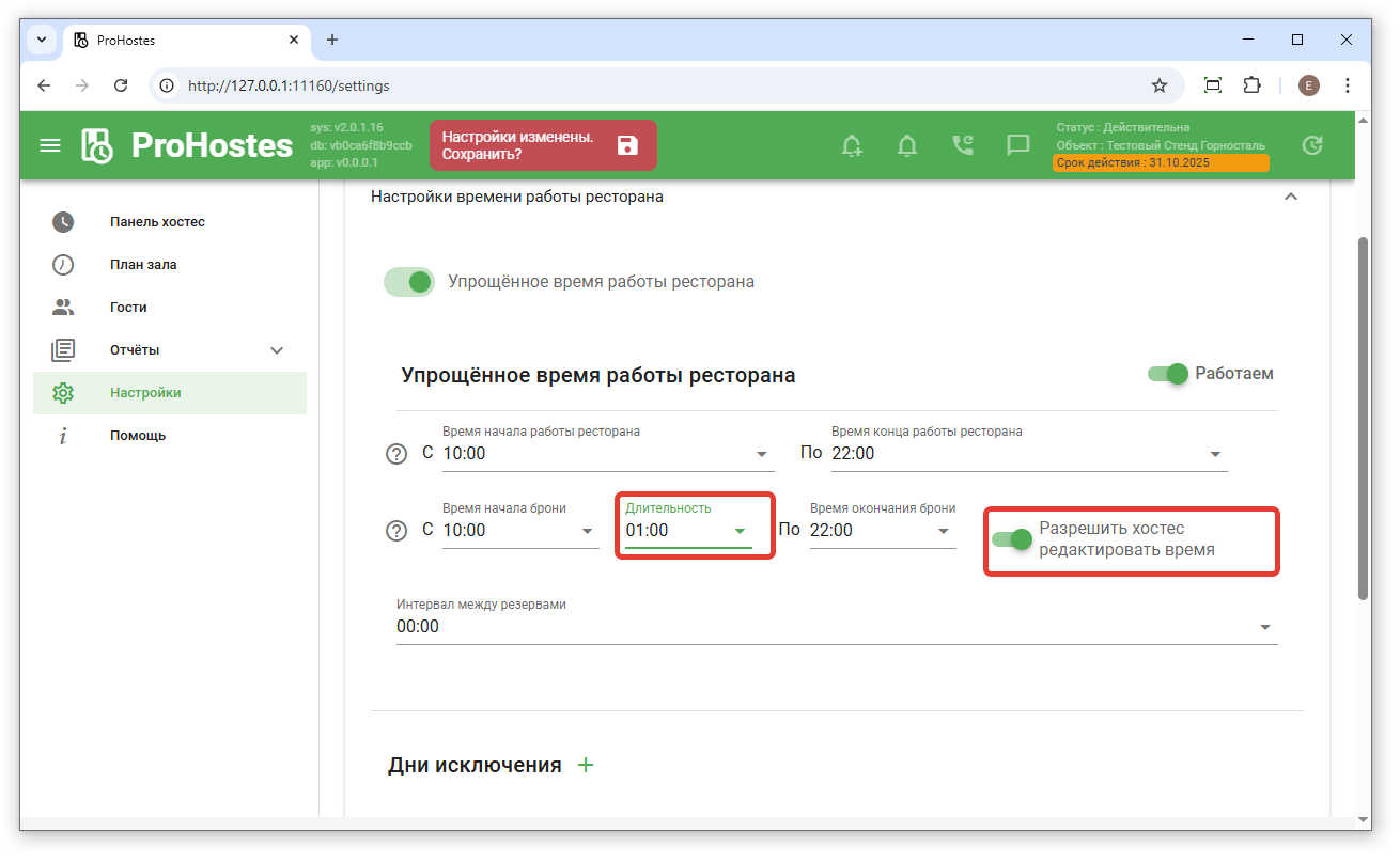 - Переключатель «Разрешить хостес редактировать время». Если включен - хостес сможет изменить длительность брони. Если выключен - длительность брони невозможно будет изменить в процессе её приёма.