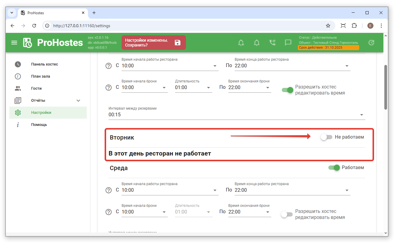 Есть 2 варианта настройки - «Упрощённое время работы ресторана» и полноценная гибкая настройка по дням недели.