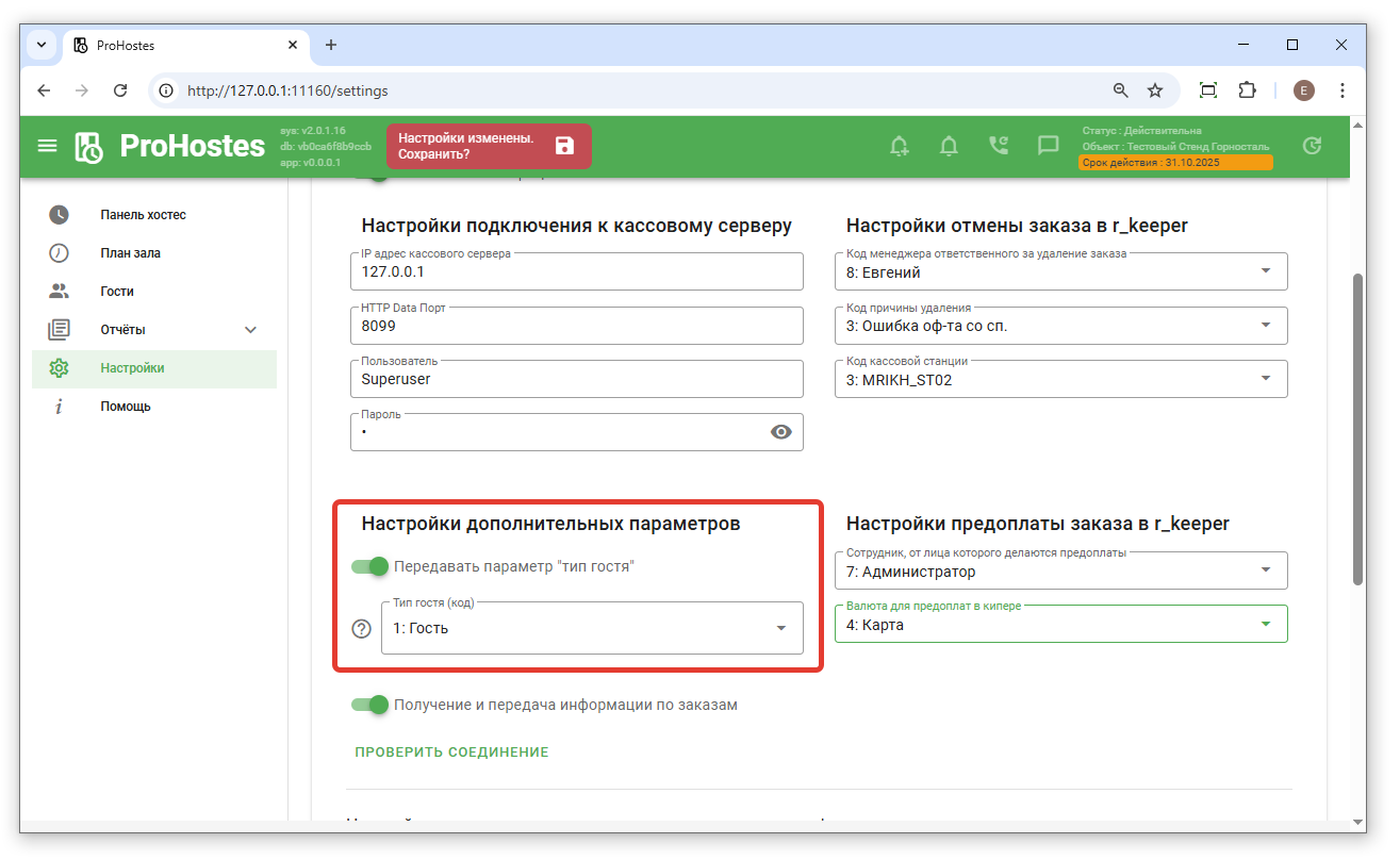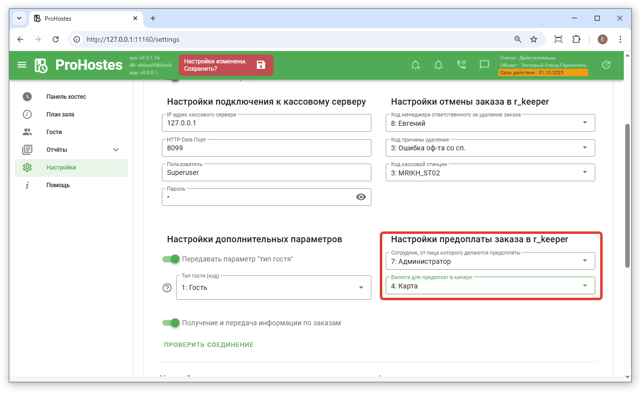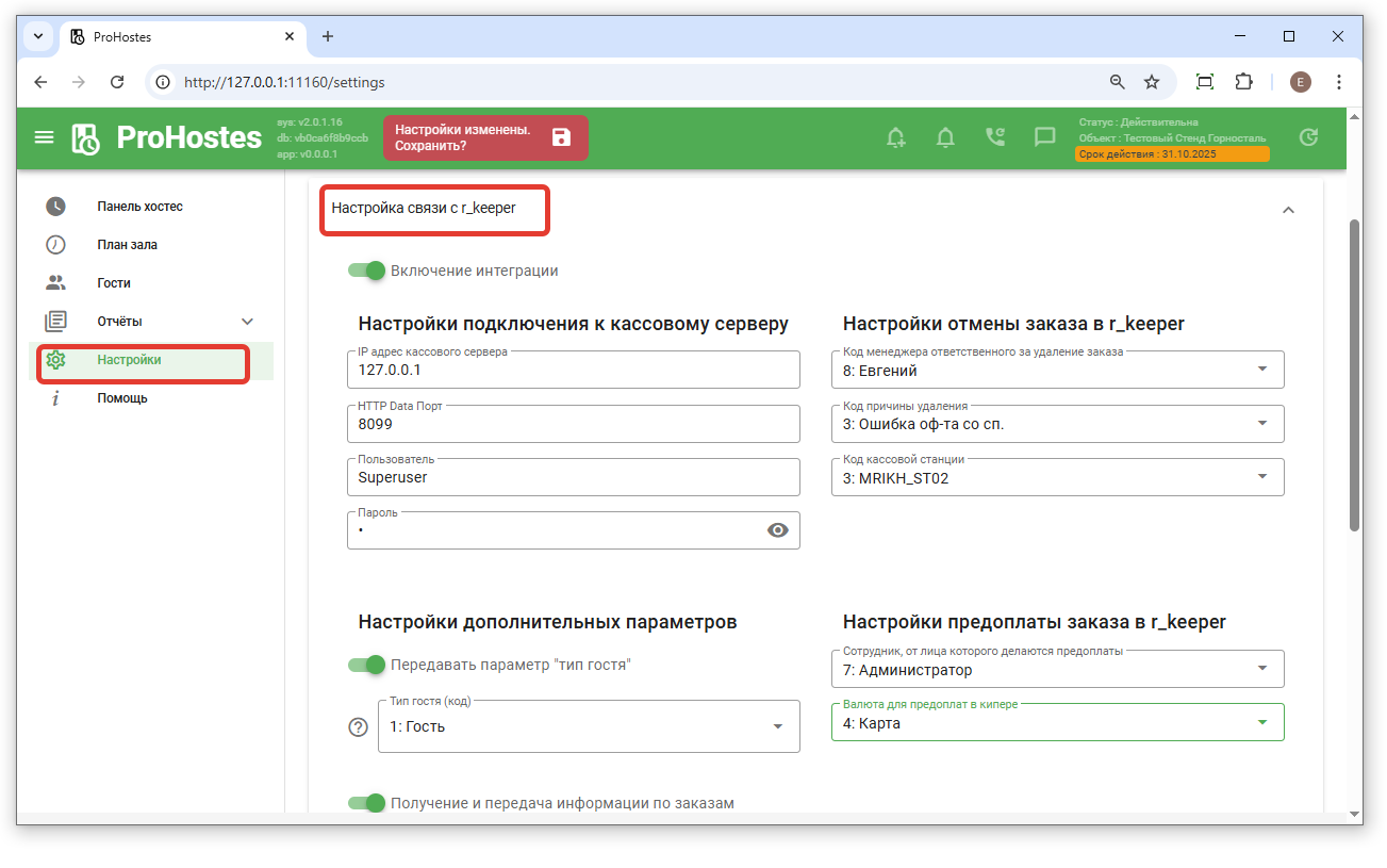 Настройка предоплаты заказа r_keeper доступны от версии ProHostes 1.16.1.176. Данная настройка передаёт из справочников r_keeper - Пользователя, от лица которого вносится предоплата и код типа валюты. Предварительная настройка, для данного параметра описана в этой статье.