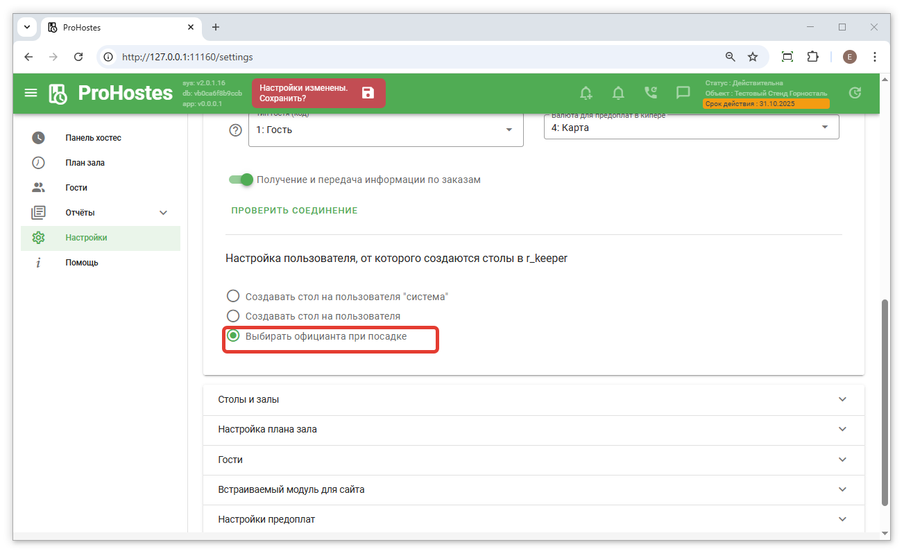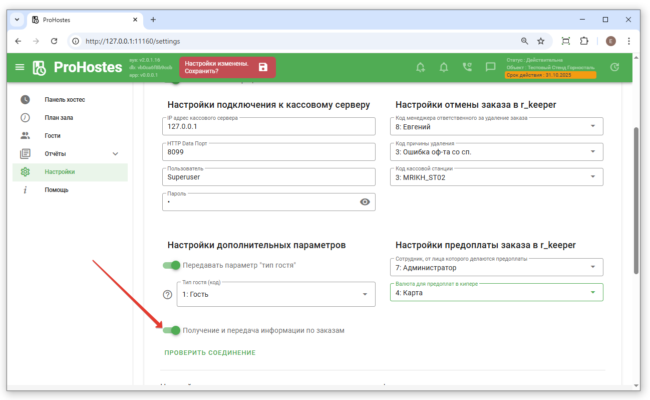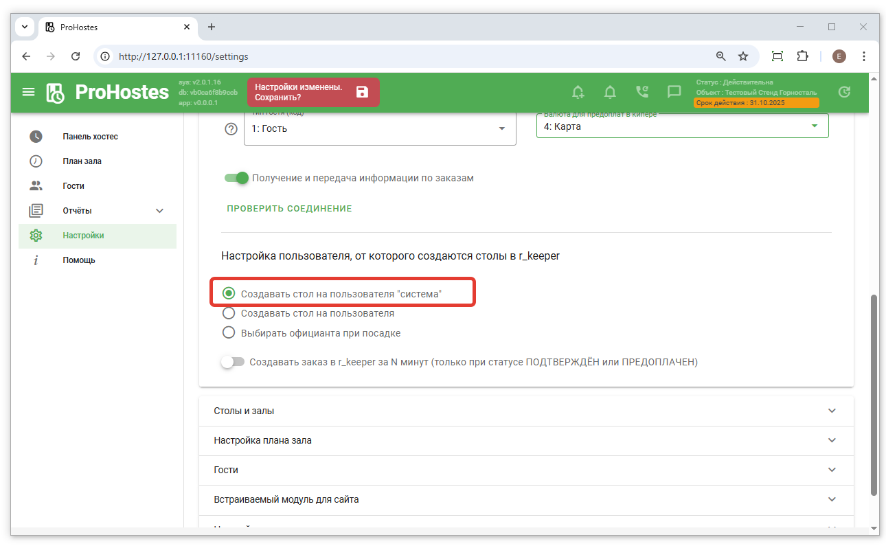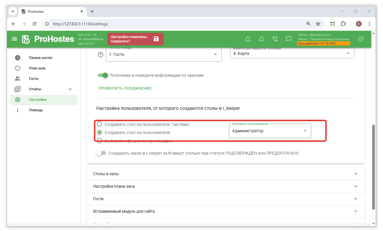 Настройка предоплаты заказа r_keeper доступны от версии ProHostes 1.16.1.176. Данная настройка передаёт из справочников r_keeper - Пользователя, от лица которого вносится предоплата и код типа валюты. Предварительная настройка, для данного параметра описана в этой статье.