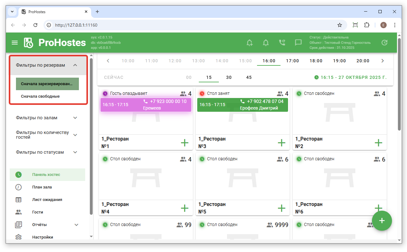 Доступно 2 положения - сначала зарезервированные и сначала свободные. Также доступно положение «без фильтра» - в этом случае столы и брони отображаются в очередности по умолчанию.