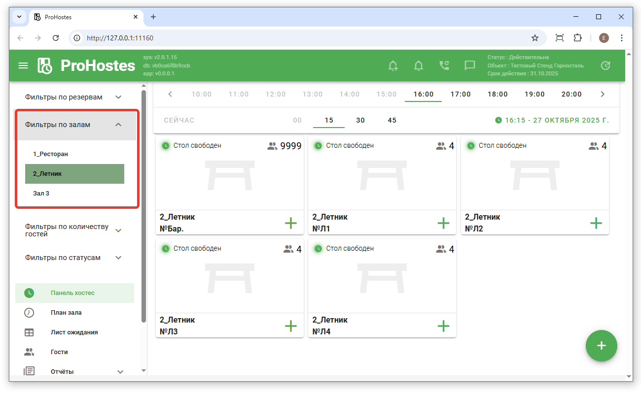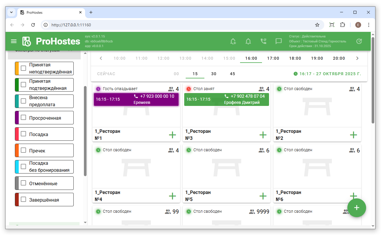 - Завершенные - столы бронь которых завершена.(Данный фильтр доступен с версии 1.10.7.98) Условие фильтрации включает в себя столики, бронирование которых открыто через ProHostes, а также столики, которые ранее имели статус "Посадка без бронирования".