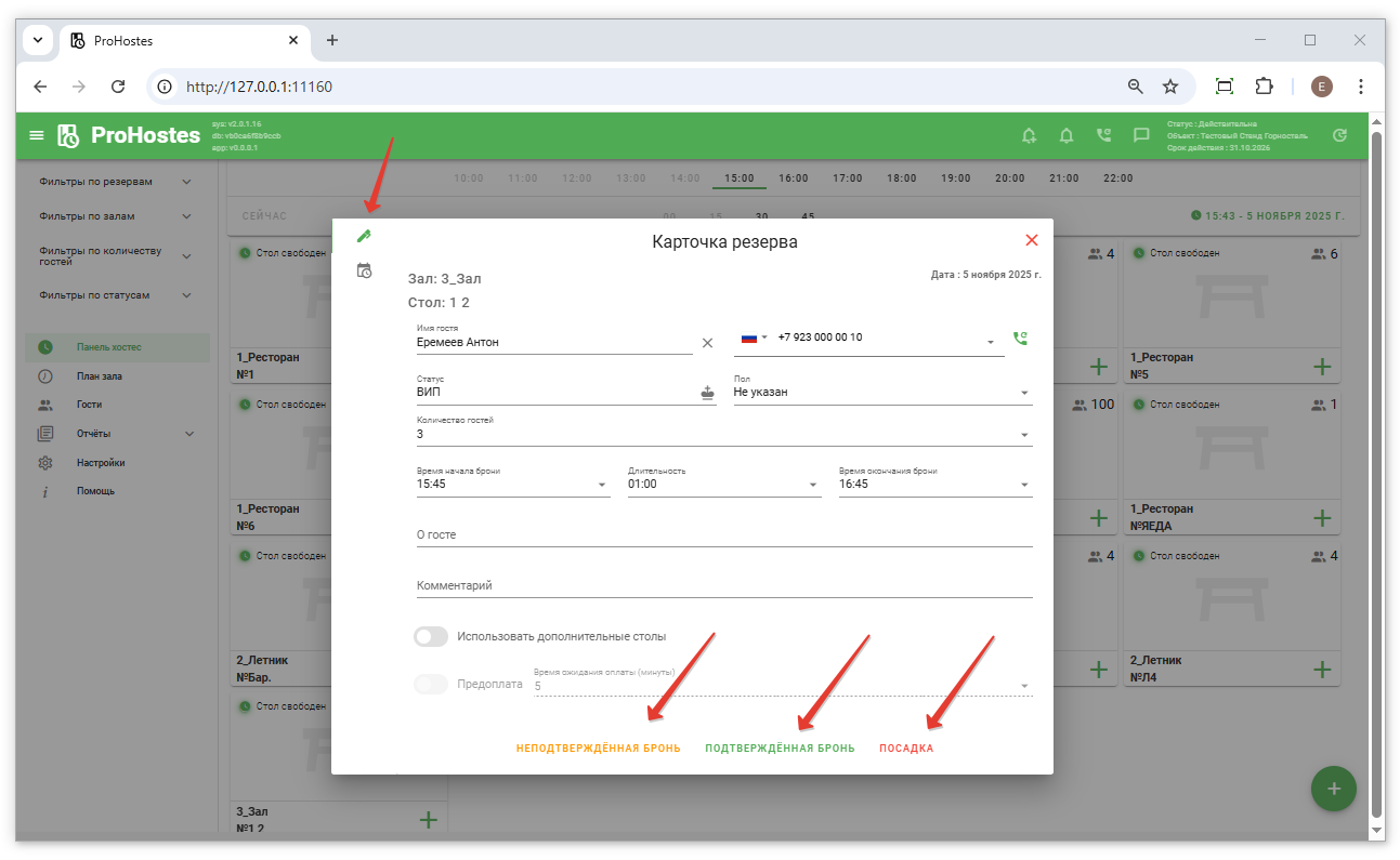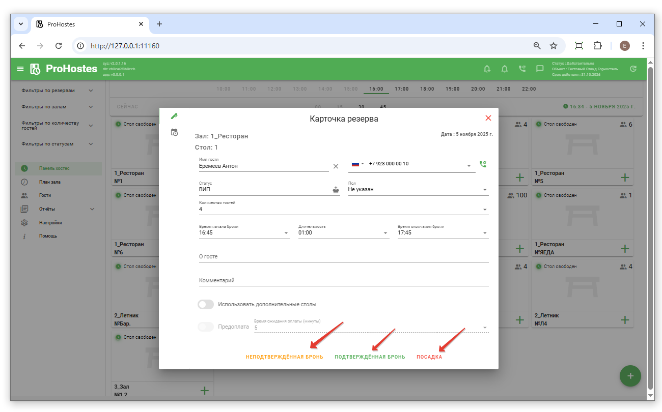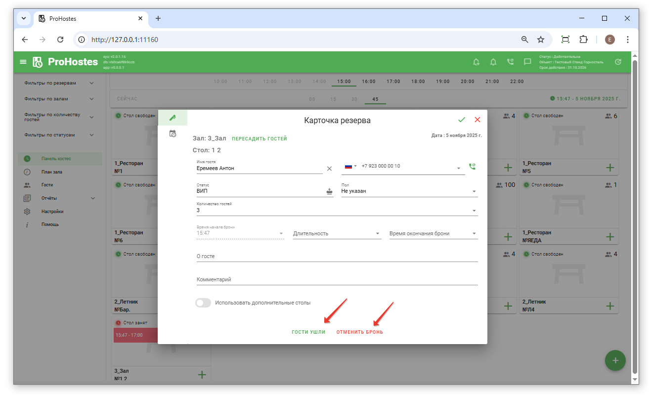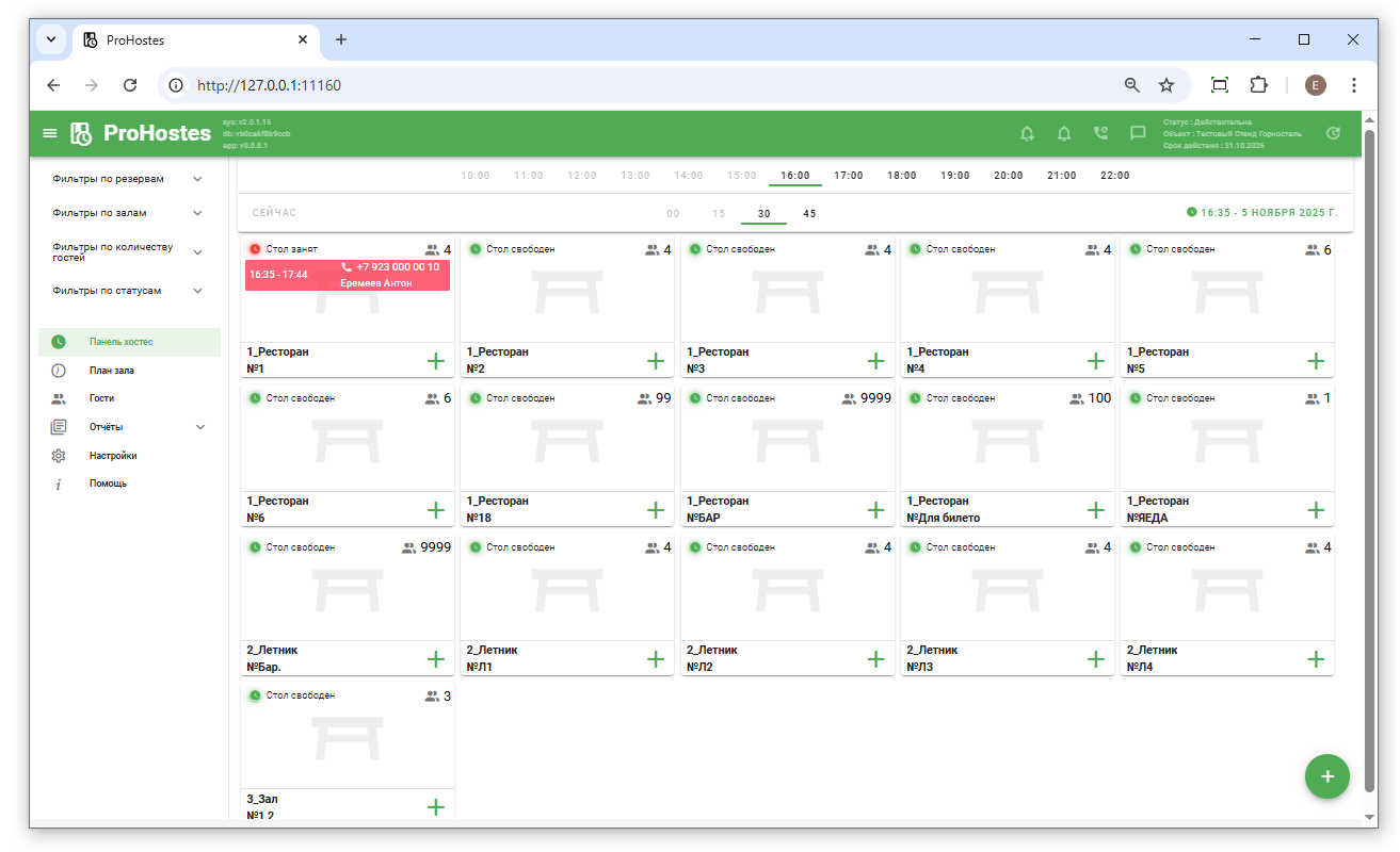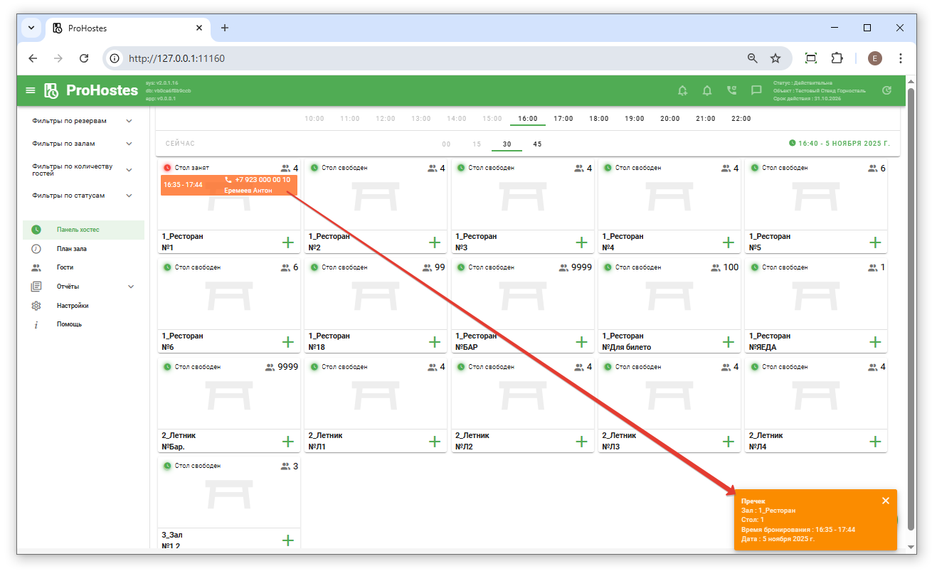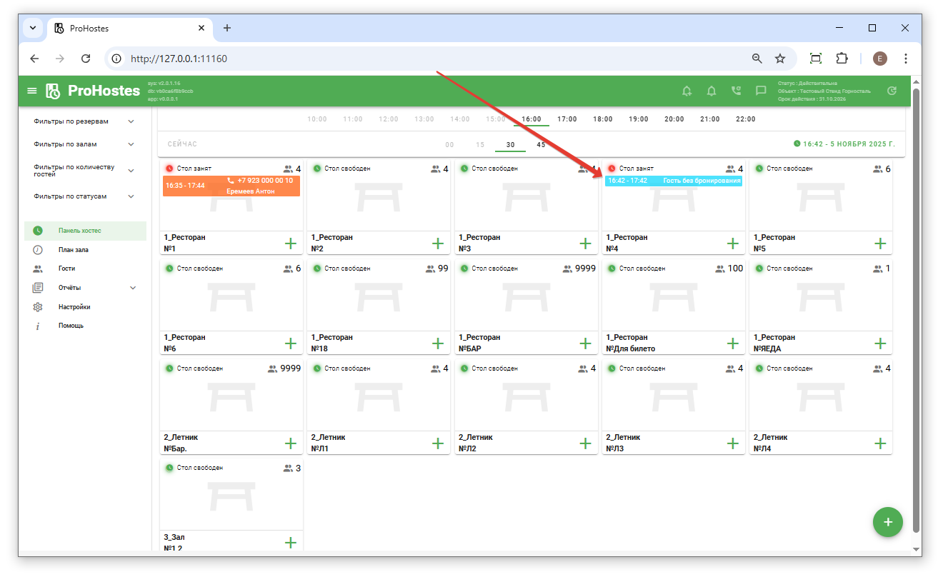 Все существующие брони отображаются на рабочей области хостес разными цветами. В зависимости от выбранного на шкале времени момента отображаются брони на выбранный момент и те который будут позже в указанный день. Завершенные брони с рабочей области пропадают.