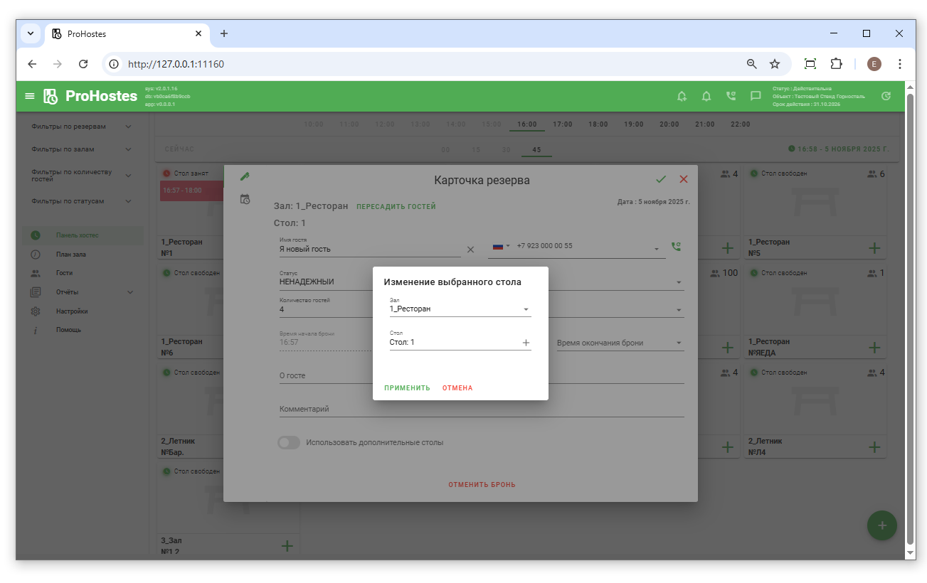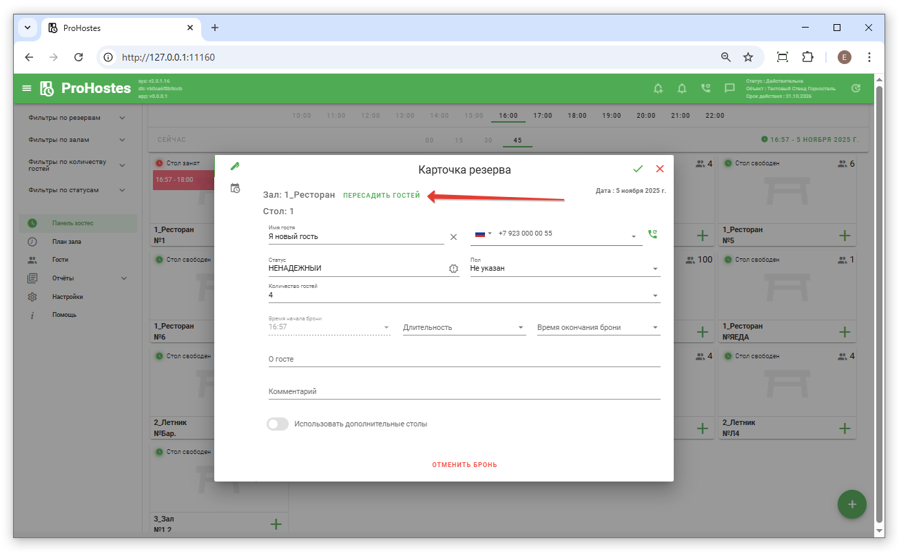 Гости могут быть пересажены между столами, это делается из интерфейса ProHostes.
