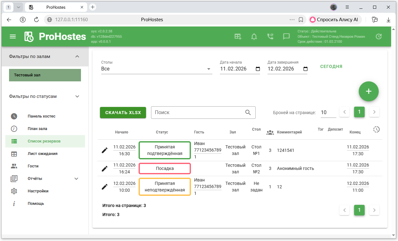 После успешного оформления бронирования в таблице автоматически отображается полная информация по созданной брони.