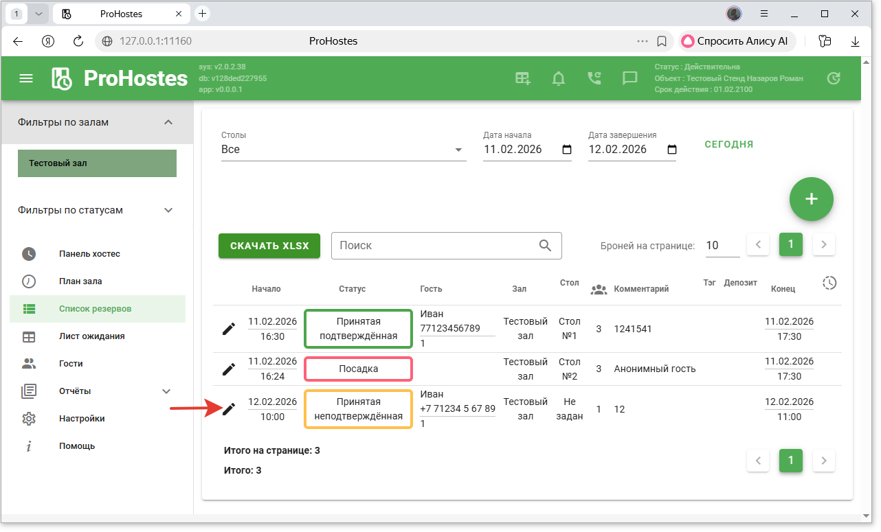 Кроме того, интерфейс таблицы позволяет редактировать уже существующие бронирования. Для этого необходимо: