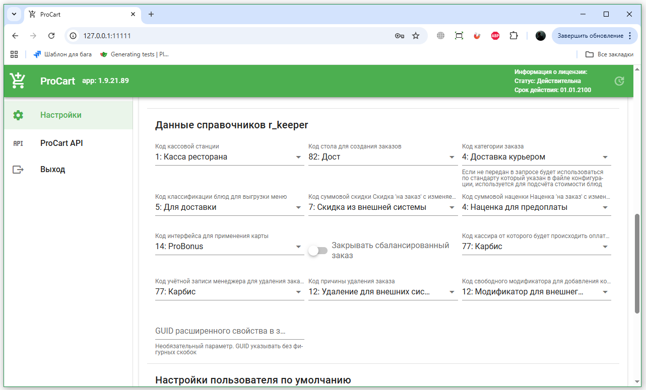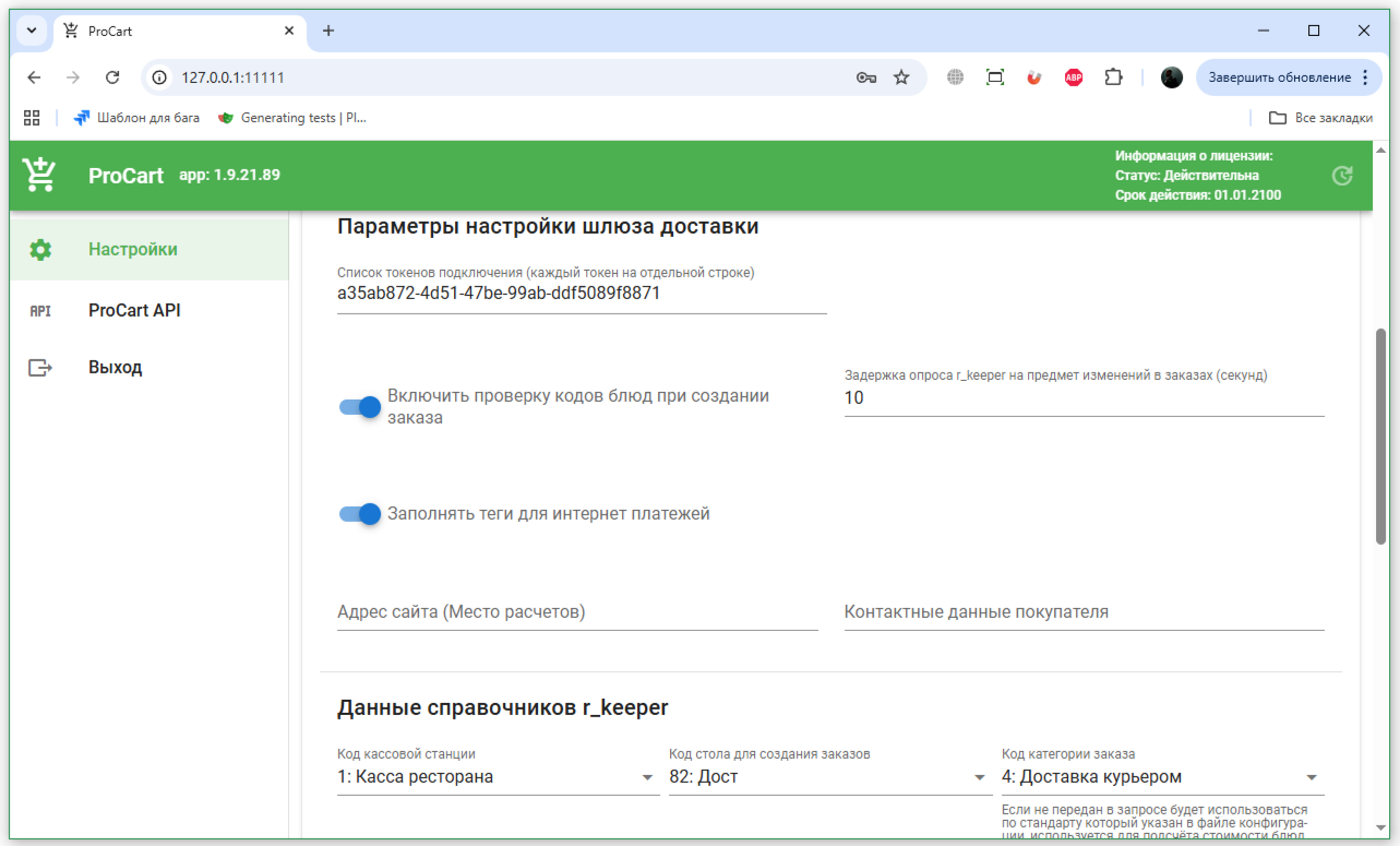 Админка доступна от версии ProCart 1.9.21.89. Все изменения вступят в силу только после сохранения настроек и перезапуска ProCart.