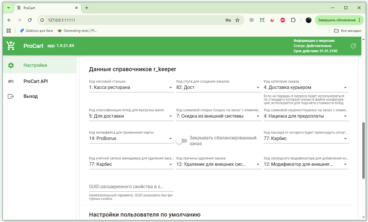Админка доступна от версии ProCart 1.9.21.89. Все изменения вступят в силу только после сохранения настроек и перезапуска ProCart.