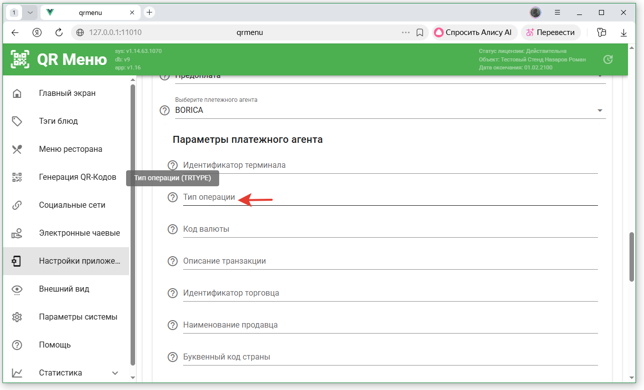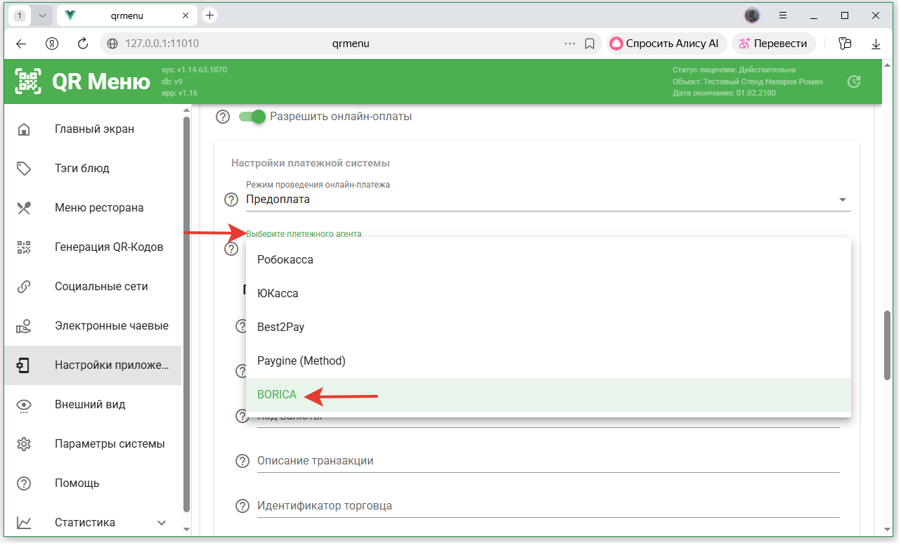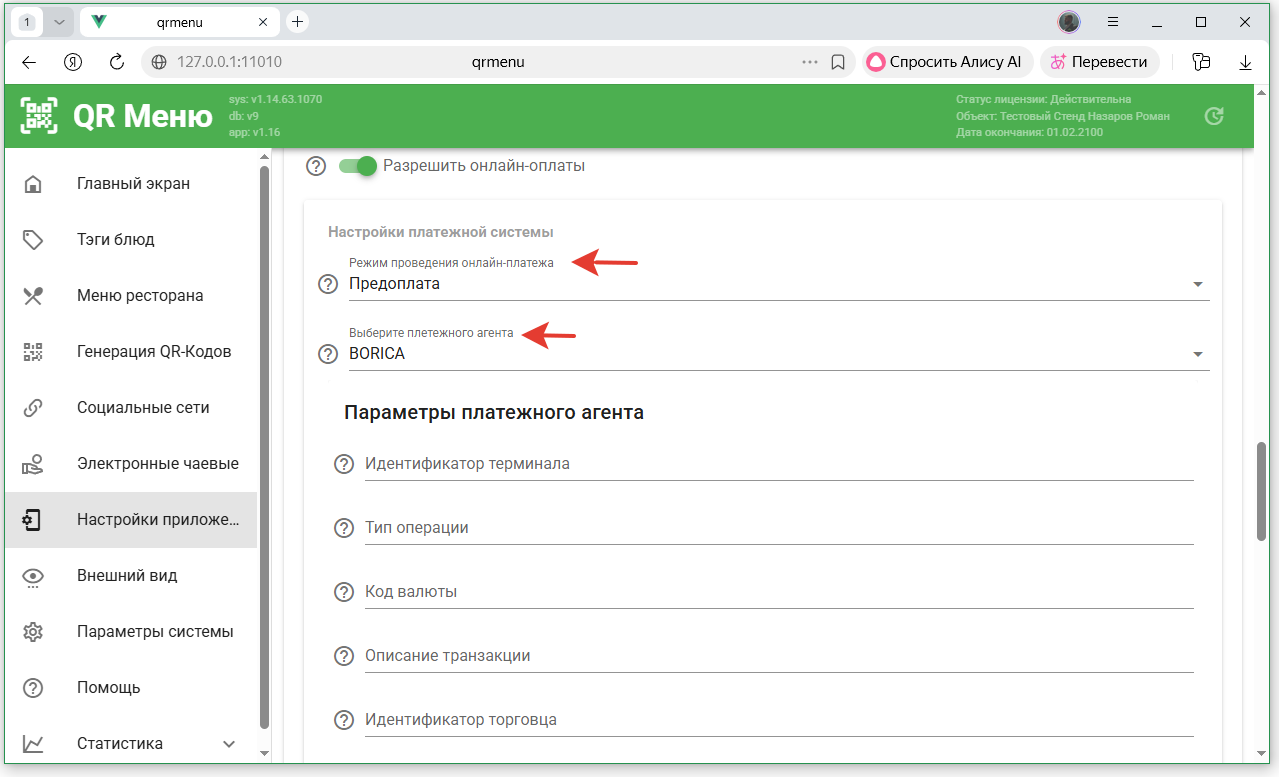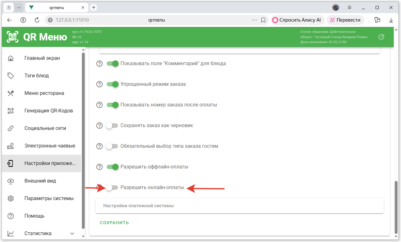 - В настройках приложения QR-Menu включить онлайн оплаты