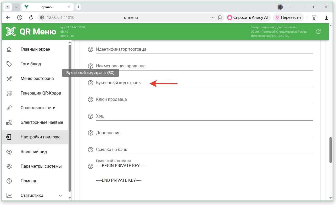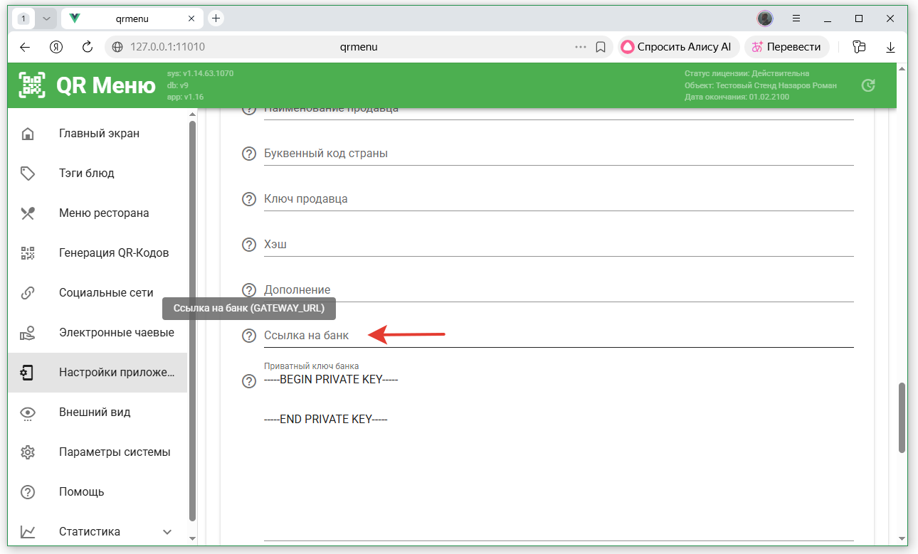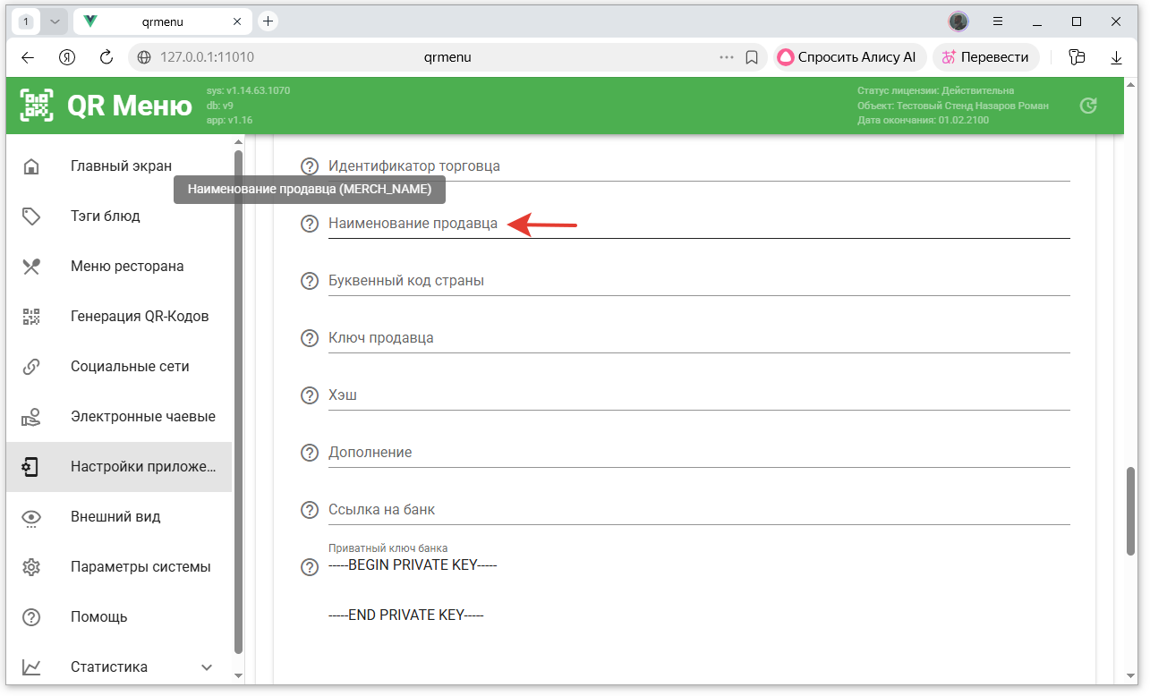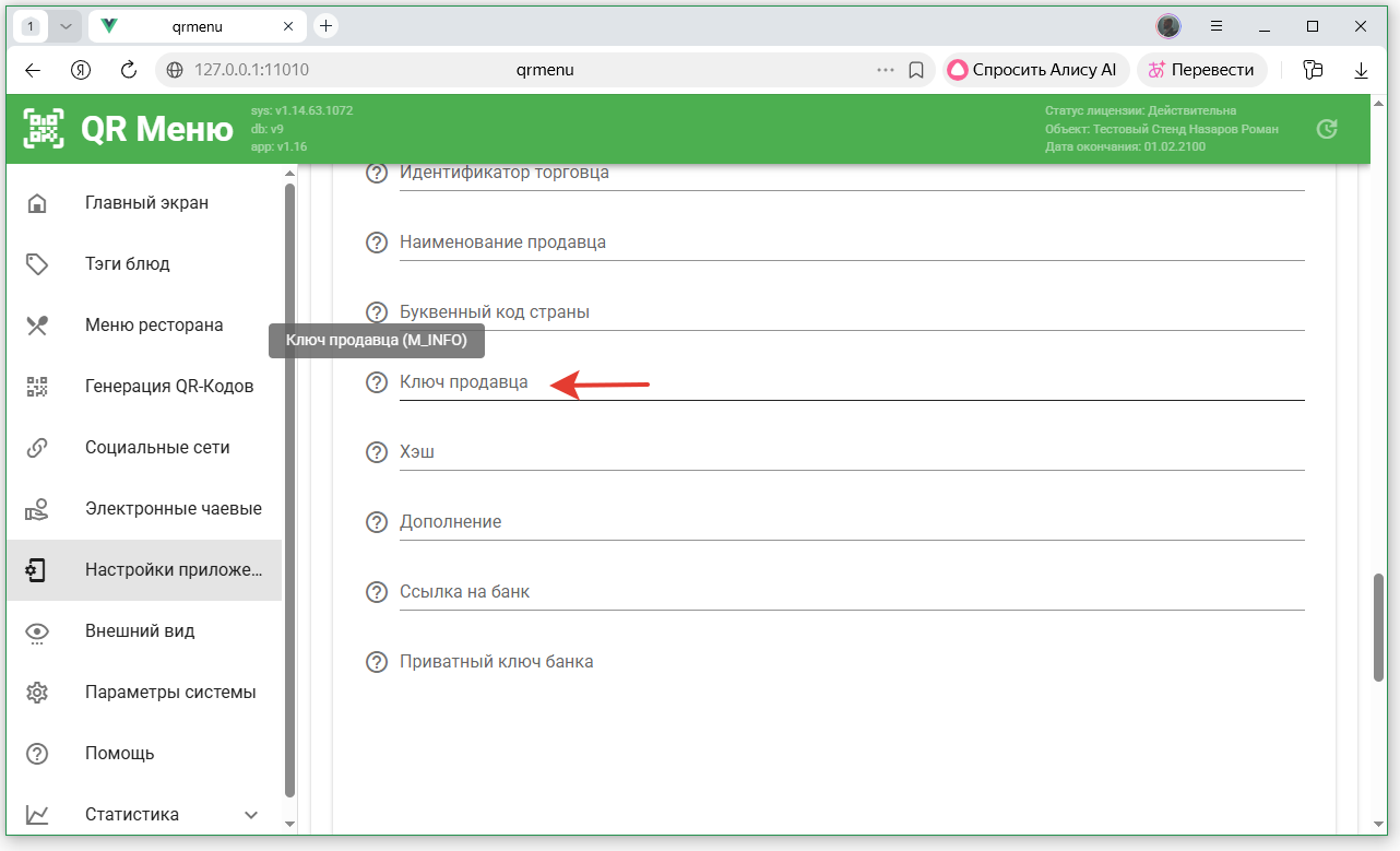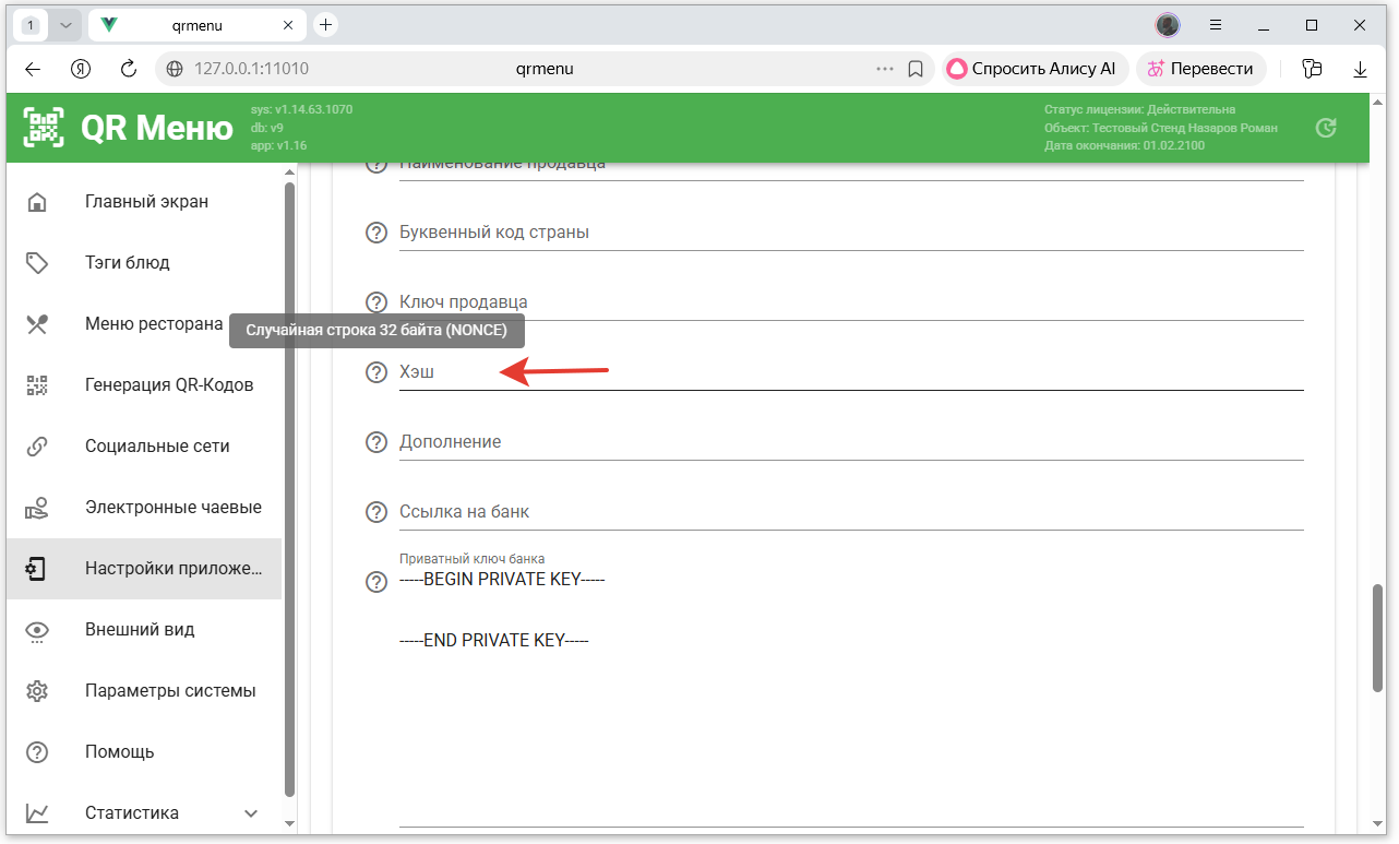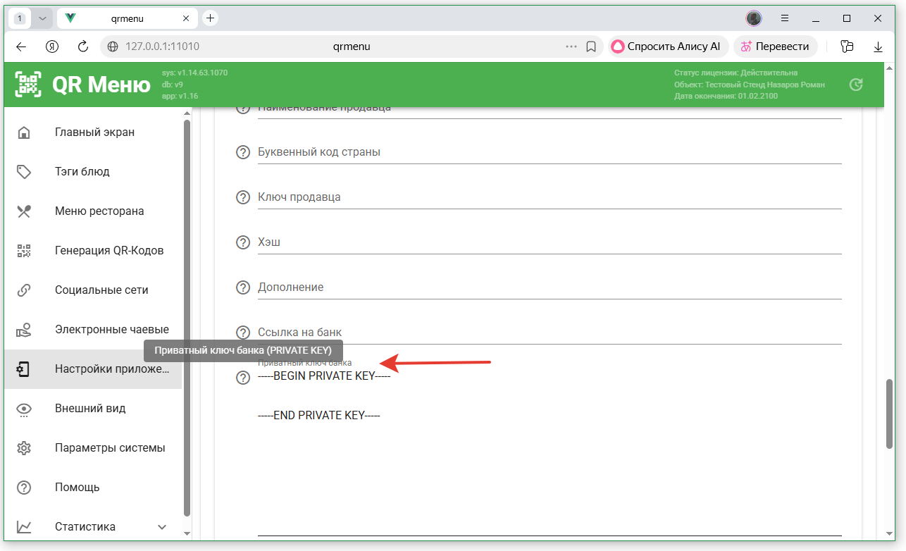 - Скопировать значение поля «Пароль для подписи» в поле «Пароль для формирования цифровой подписи» в QR-Menu
