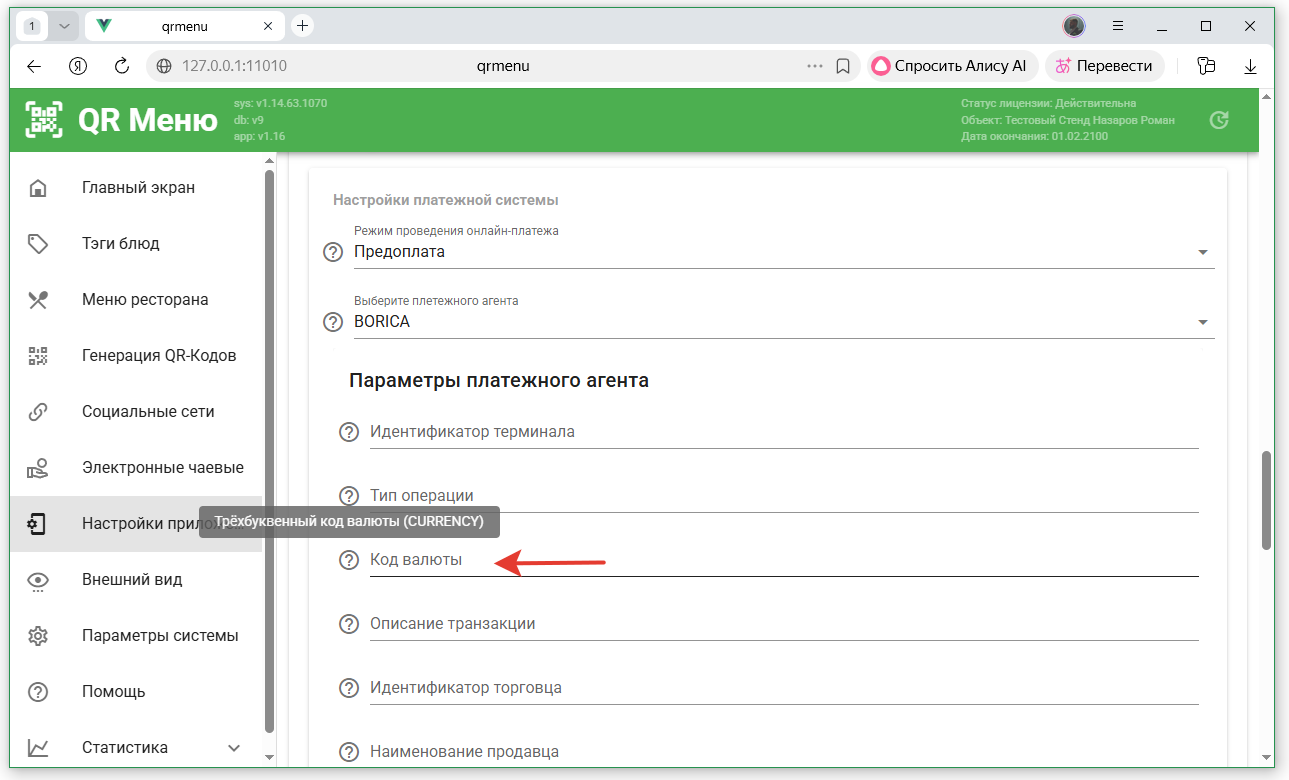 - Указать код валюты в настройках QR-Menu в поле «Код валюты» в соответствии ISO 4217