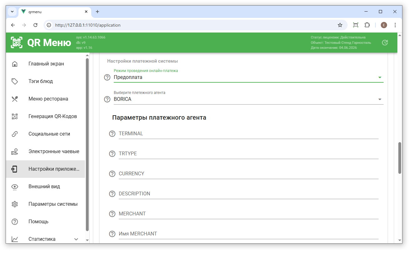 - В настройках приложения QR-Menu включить онлайн оплаты