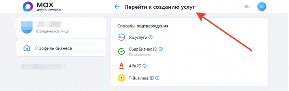 4. При успешном подтверждении станет доступна кнопка «Перейти к созданию услуг» Пример: