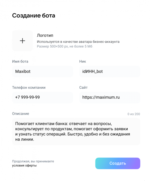 При создании бота все поля обязательны для заполнения, включая логотип! Важно: информация которую вы тут заполните - это первое что будет видеть гость при обращении к боту.