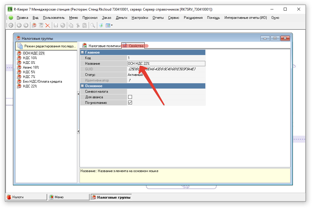 3.1) Если ресторан работает с предоплатами - аналогичные настройки делаем для налоговой группы, используемой для предоплат (авансов).